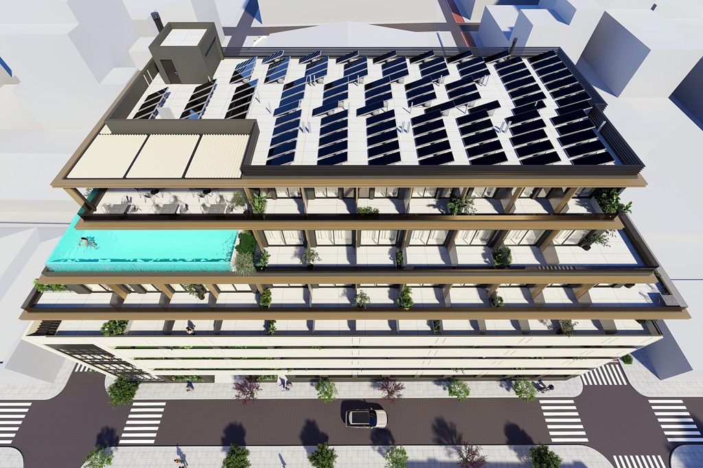 Το υφιστάμενο κτιριακό κέλυφος διαμορφώθηκε κατάλληλα με σκοπό να φιλοξενήσει 156 κατοικίες, οι οποίες ανταποκρίνονται λειτουργικά και αισθητικά στις απαιτήσεις του σύγχρονου τρόπου ζωής. Παράλληλα, αναπτύσσει δευτερεύουσες χρήσεις όπως κατάστημα υγειονομικού ενδιαφέροντος, γυμναστήριο και χώρους γραφείων.