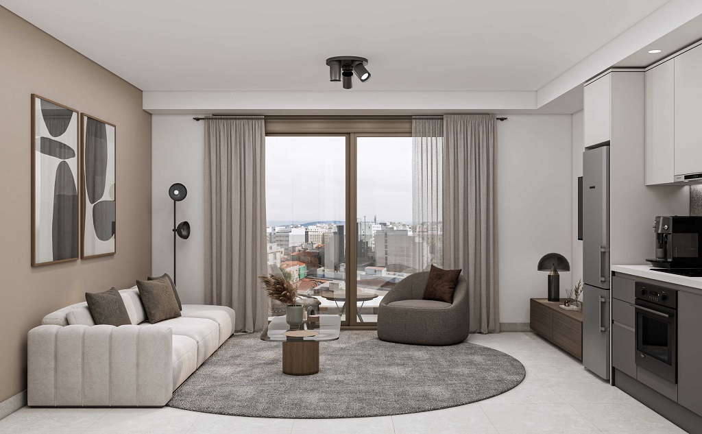 Δεκαώροφο κτίριο είκοσι οχτώ διαμερισμάτων στο κέντρο του Πειραιά, δίπλα από το λιμάνι.